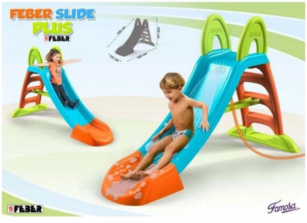 Feber Τσουλήθρα Plus Με Νερό Τσουλήθρα με υποδοχή για λάστιχο νερού για να παίζει το παιδάκι σας. Φωτεινά χρώματα με αντοχή στις ακτίνες του ήλιου και τις αλλαγές θερμοκρασίας. Με πλατιά σκαλιά και χερούλια για μεγαλύτερη ασφάλεια και στήριξη. Διαστάσεις τσουλήθρας:161x71x103 εκ.