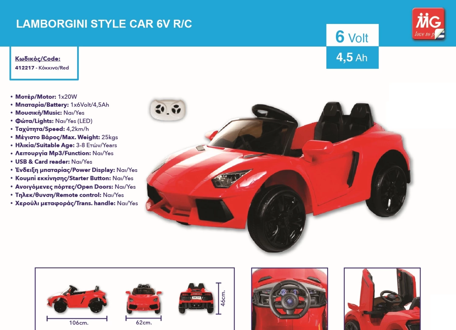 MG Toys Τηλεκατευθυνομενο Μπαταριοκινητο Αυτοκινητο R/C Lamb Race 6V Σε Κοκκινο Χρωμα (412217)
