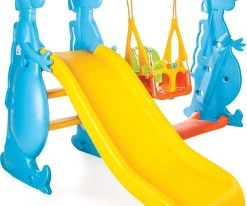 Μία παιδική χαρά, περιλαμβάνει τσουλήθρα, κούνια, αθλητικές δραστηριότητες, κατάλληλο για εξωτερική και εσωτερική χρήση. Η κούνια έχει ζώνη τριπλής ασφάλειας και η τσουλήθρα μήκος (120) cm. Έχει βράχο αναρρίχησης και τα πλαϊνά έχουν μπασκέτα για παιχνίδι!